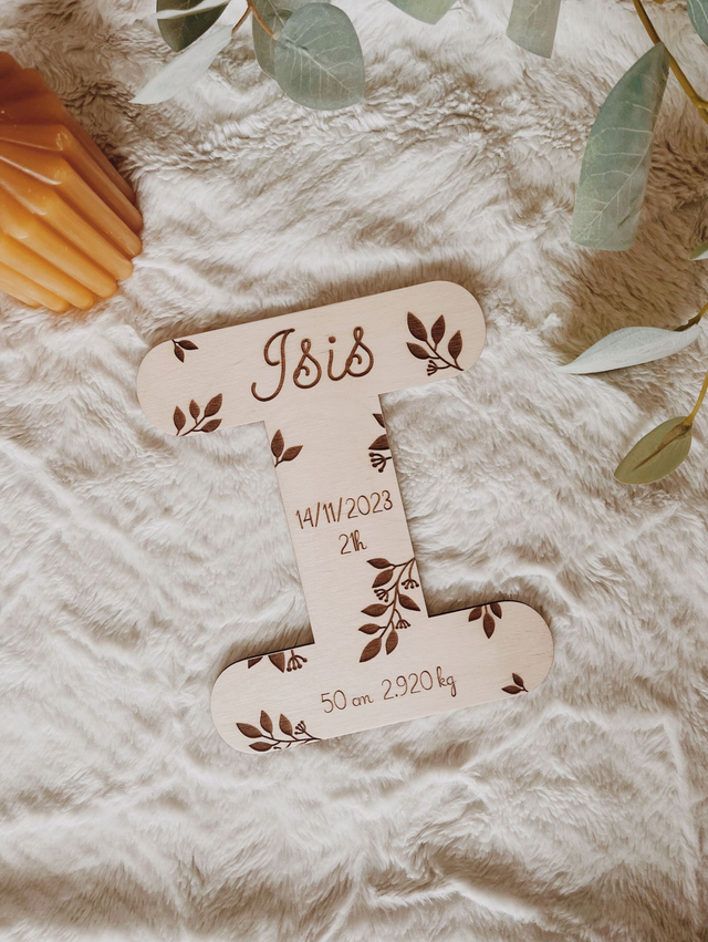 Découvrez une lettre de naissance en bois entièrement personnalisée, pensée pour célébrer l’arrivée de bébé avec douceur et poésie. Chaque pièce est gravée avec soin pour offrir un souvenir unique : le prénom, la date et l’heure de naissance, la taille et le poids sont délicatement inscrits sur la lettre initiale. Les motifs floraux gravés apportent une touche naturelle et élégante, parfaite pour embellir une chambre d’enfant ou accompagner de jolies photos de naissance.