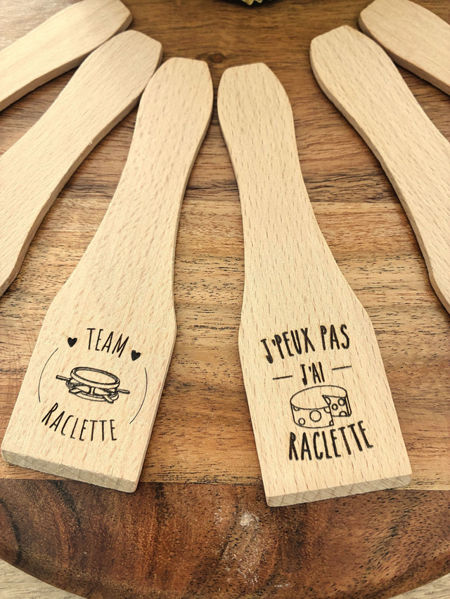 Ajoutez une touche d’humour (et beaucoup de gourmandise !) à vos soirées raclette grâce à nos spatules en bois gravées.