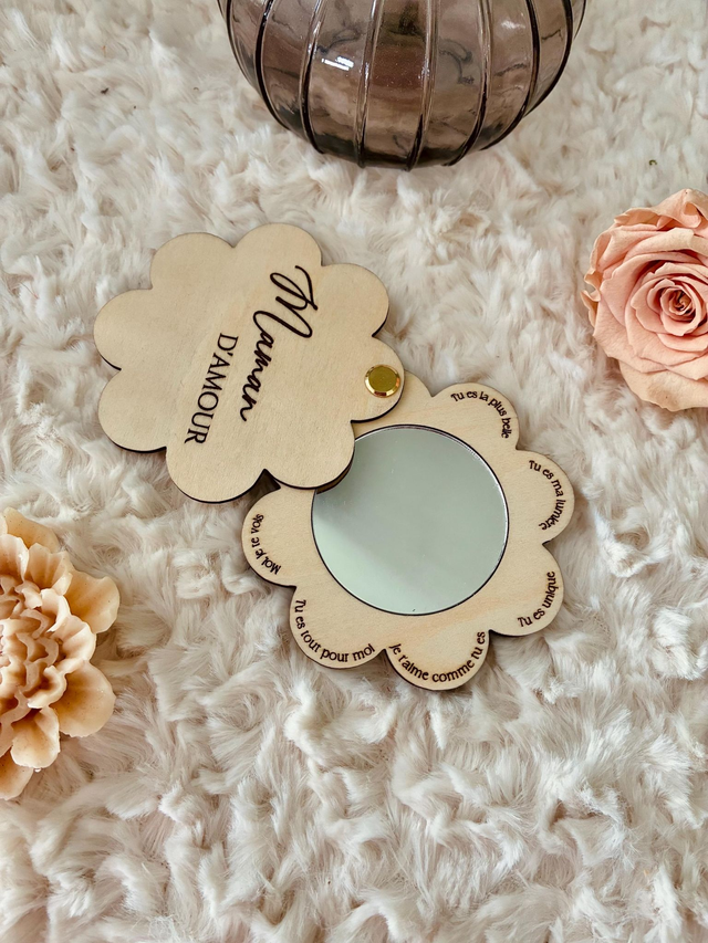 Un miroir de poche délicat en bois naturel, gravé du message “Maman d’Amour” sur le dessus.